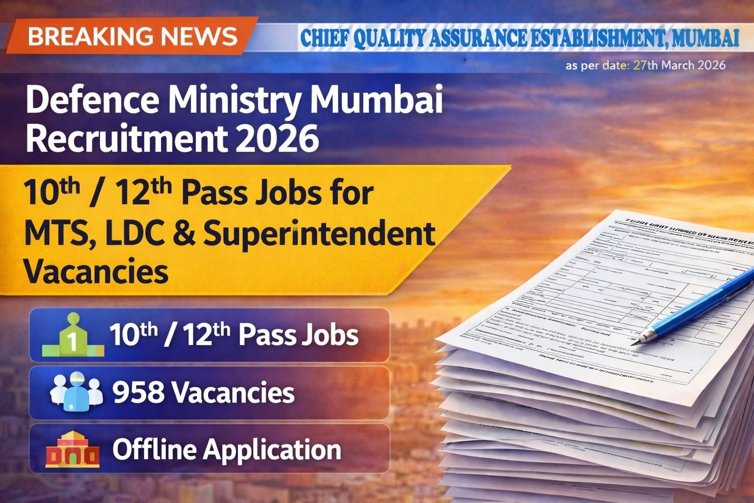 रक्षा मंत्रालय मुंबई भर्ती 2026 : 10वीं/12वीं पास के लिए MTS, LDC और सुपरिंटेंडेंट पदों पर भर्ती